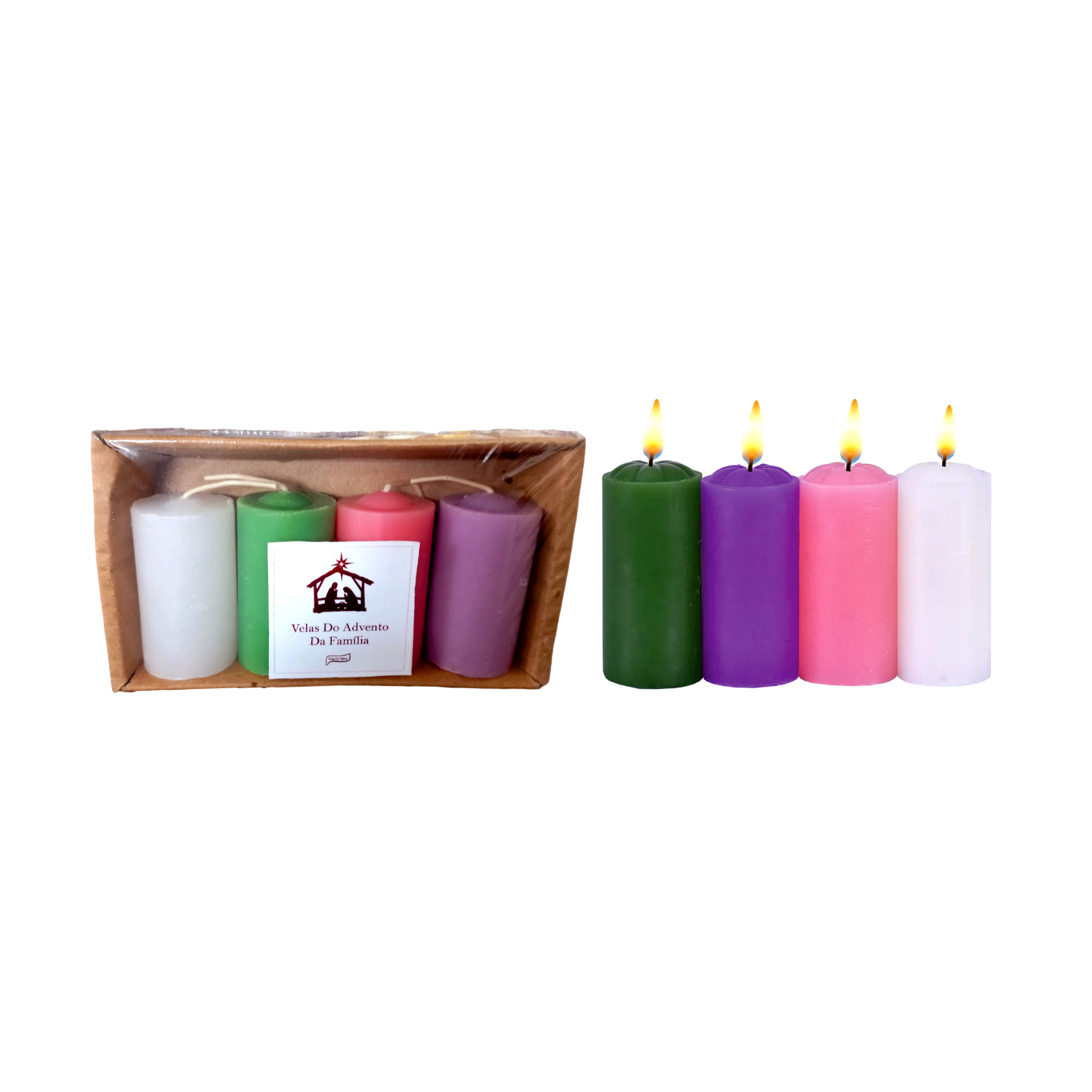 Quatro velas do Advento de 50g cada, das seguintes cores: vermelha, roxa, verde e branca.