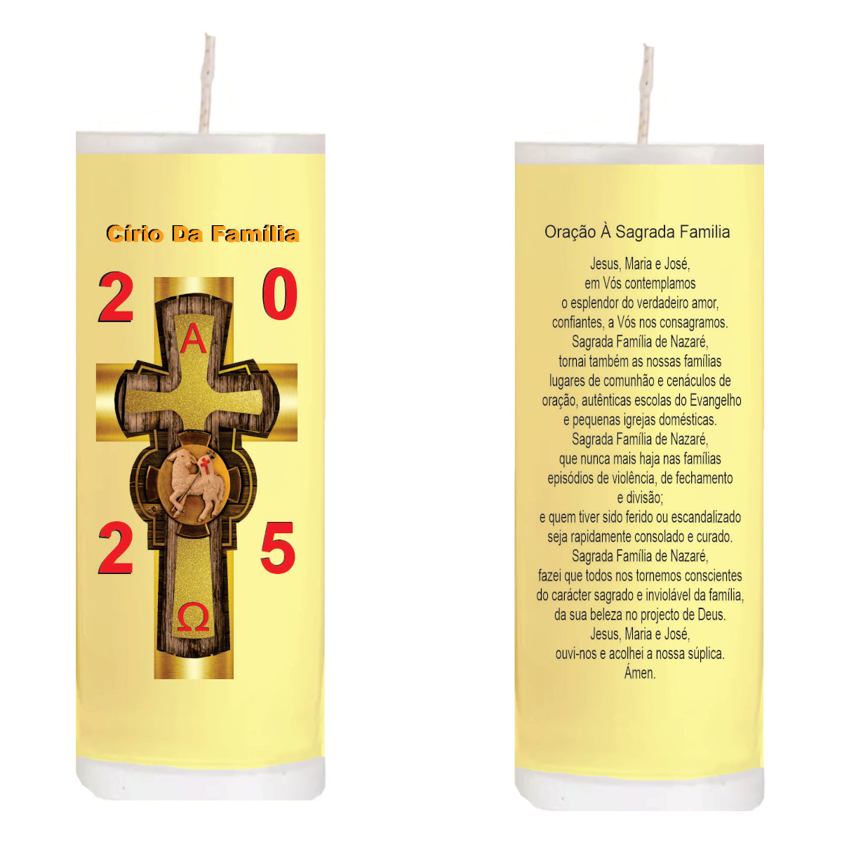 - 1 mini círio Pascal da Família no tamanho de 15 cm de altura por 5 cm de diâmetro adesiva do com imagem e horarão.