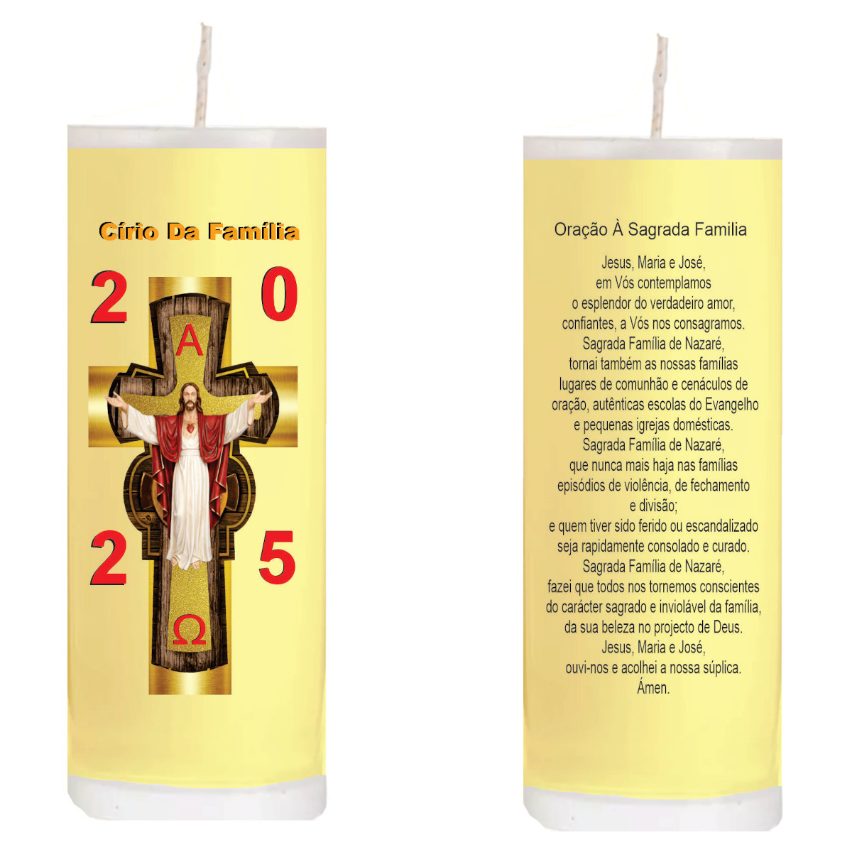 - 1 mini círio Pascal da Família no tamanho de 15 cm de altura por 5 cm de diâmetro adesiva do com imagem e horarão.